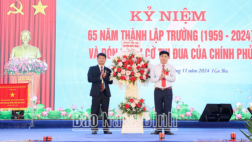 | Đồng chí Bí thư Huyện ủy Nam Trực Lưu Quang Tuyển tặng hoa chúc mừng trường THPT Lý Tự Trọng. |