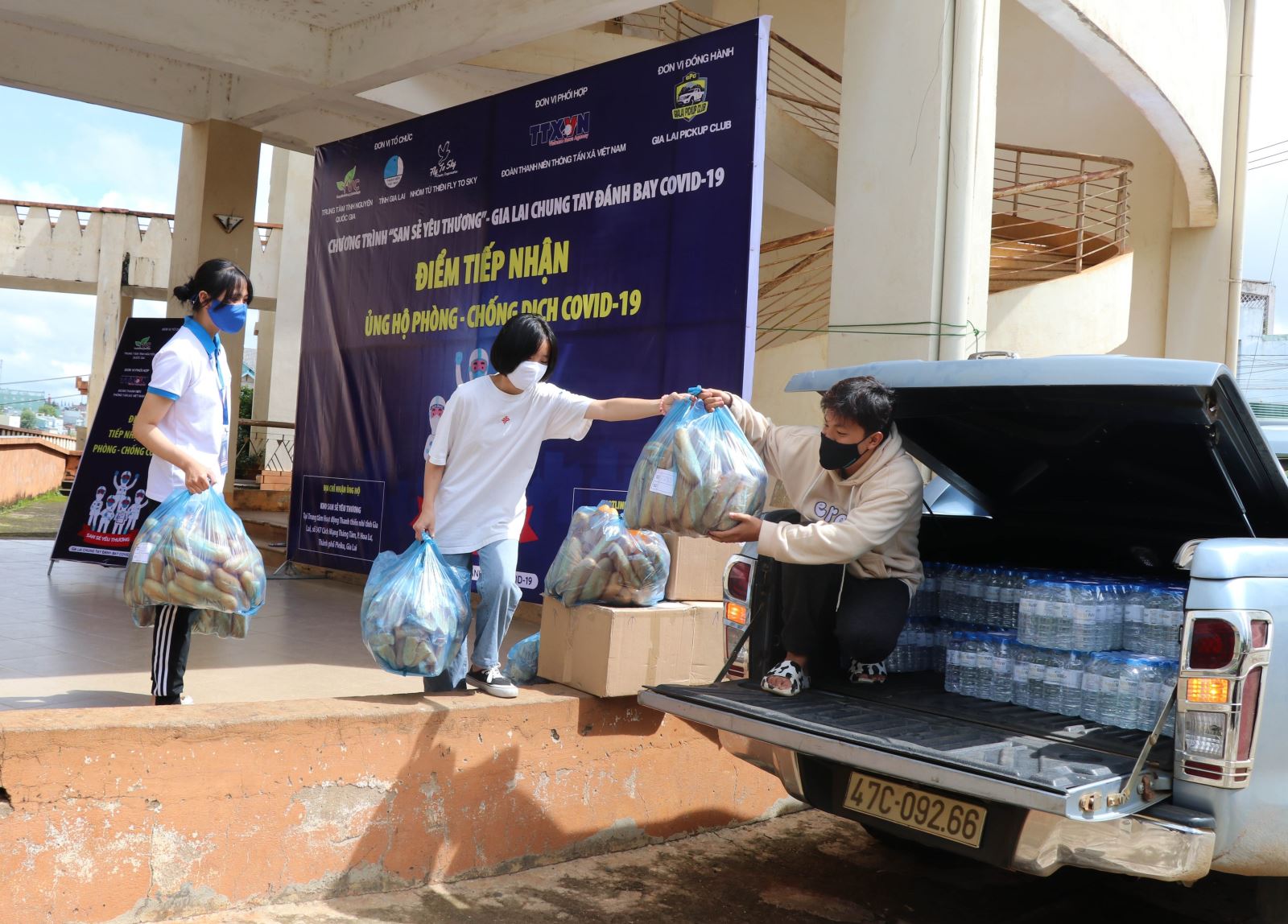 Các đoàn viên thanh niên hỗ trợ vận chuyển hàng hóa lên xe đưa đến các khu cách ly trên địa bàn tỉnh Gia Lai.