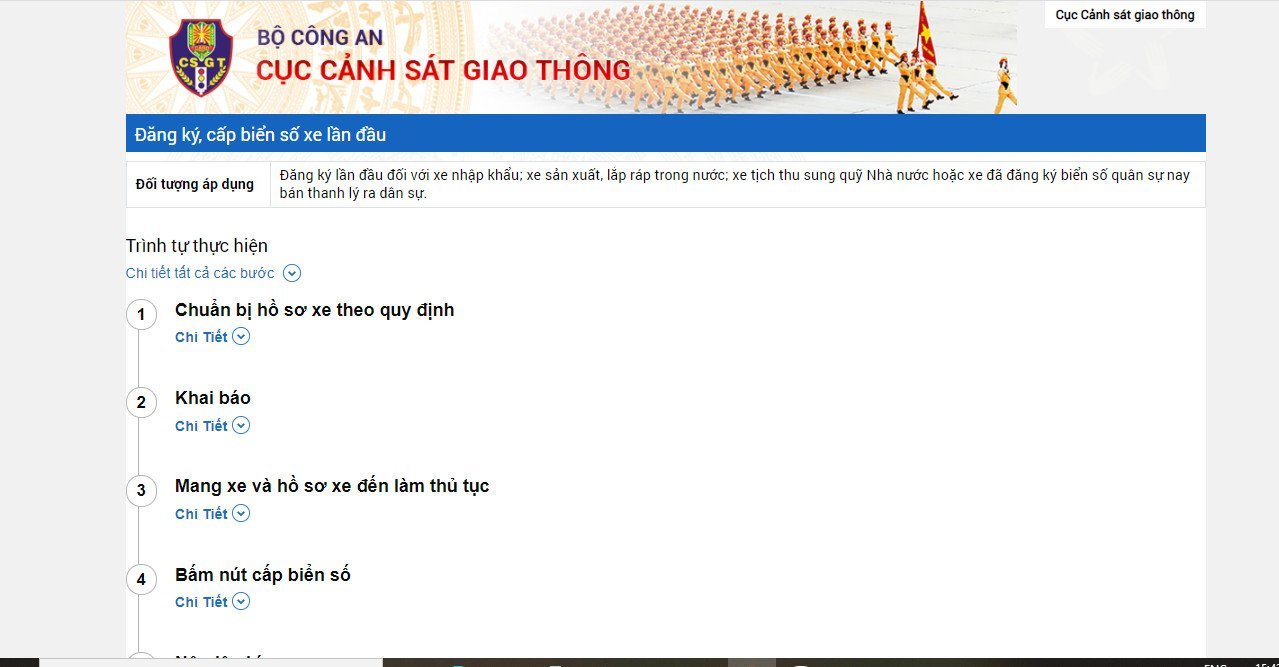 Người dân khi đăng nhập chuyên mục “Đăng ký, khai báo phương tiện” sẽ được hướng dẫn đầy đủ chi tiết quá trình các bước thực hiện đăng ký xe bao gồm hướng dẫn chuẩn bị hồ sơ giấy tờ cho các hình thức như: Đăng ký xe lần đầu/đăng ký sang tên/đăng ký tạm thời/đổi, cấp lại giấy chứng nhận đăng ký xe, biển số xe/thu hồi giấy chứng nhận đăng ký, biển số xe.
