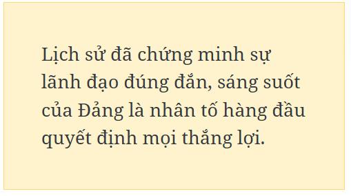 Lịch sử đã chứng minh sự lãnh đạo đúng đắn, sáng suốt của Ðảng là nhân tố hàng đầu quyết định mọi thắng lợi. Trải qua những chặng đường cách mạng gian khổ, Ðảng ta được tôi luyện và ngày càng trưởng thành, không ngừng đổi mới tư duy, phương thức lãnh đạo, tăng cường sức mạnh chiến đấu trong mọi hoàn cảnh, xứng đáng với sứ mệnh lãnh đạo cách mạng, với sự tin tưởng và kỳ vọng của nhân dân. Ôn lại lịch sử 95 năm xây dựng, chiến đấu và trưởng thành của Ðảng, tự hào về Ðảng quang vinh, chúng ta biết ơn vô hạn công lao to lớn của Chủ tịch Hồ Chí Minh, lãnh tụ thiên tài, người thầy vĩ đại của cách mạng Việt Nam, Người đã sáng lập, lãnh đạo và rèn luyện Ðảng ta. Chúng ta mãi mãi khắc ghi sự cống hiến, hy sinh của các vị lãnh đạo tiền bối, các anh hùng, liệt sĩ, những người con ưu tú của dân tộc, đã kiên cường chiến đấu, đóng góp to lớn vào sự nghiệp cách mạng của Ðảng, của dân tộc.