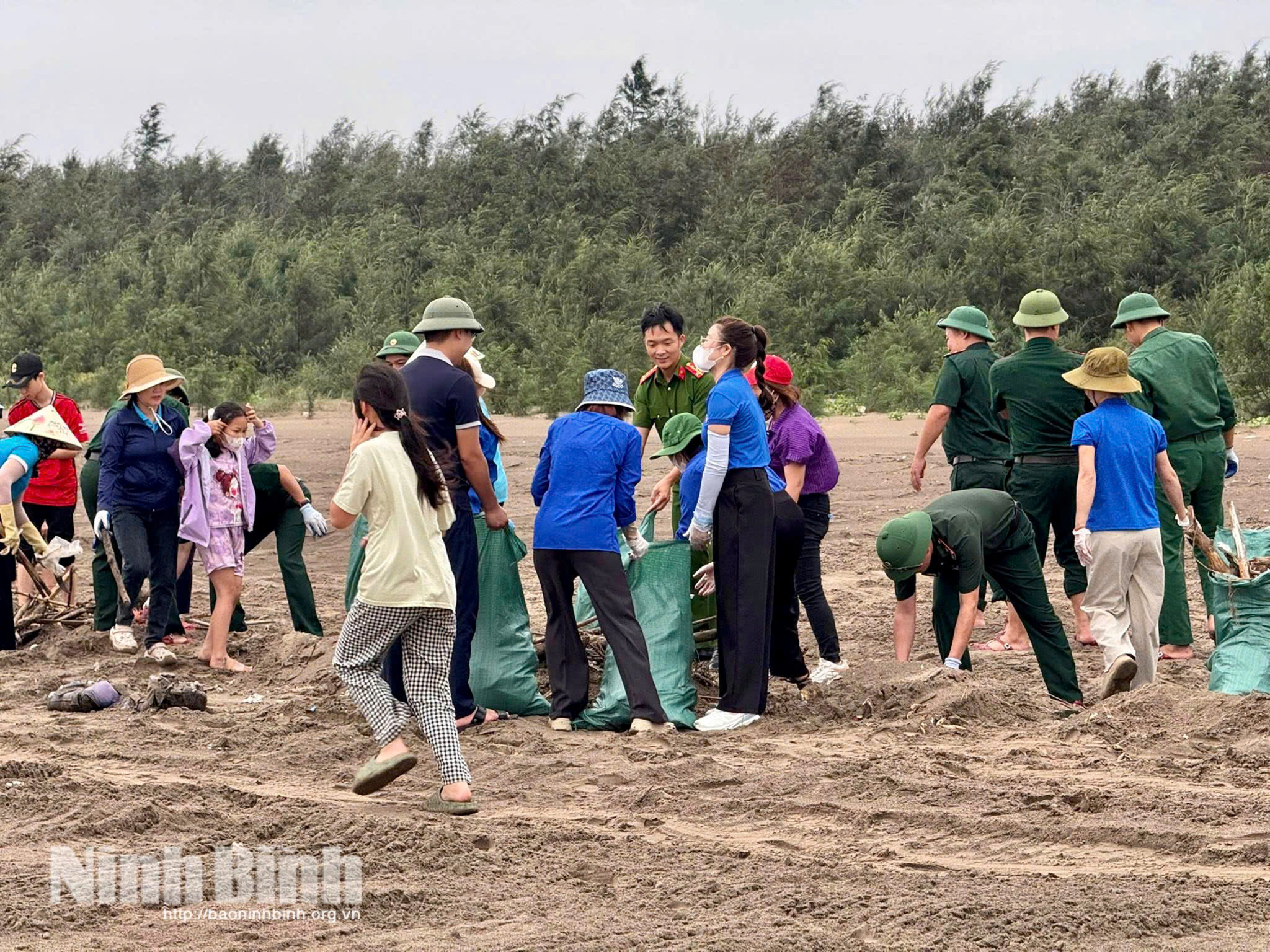 Đông đảo lực lượng trên địa bàn xã Hải Thịnh tham gia tổng dọn vệ sinh môi trường khu vực ven biển. Ảnh: Trần Sắc