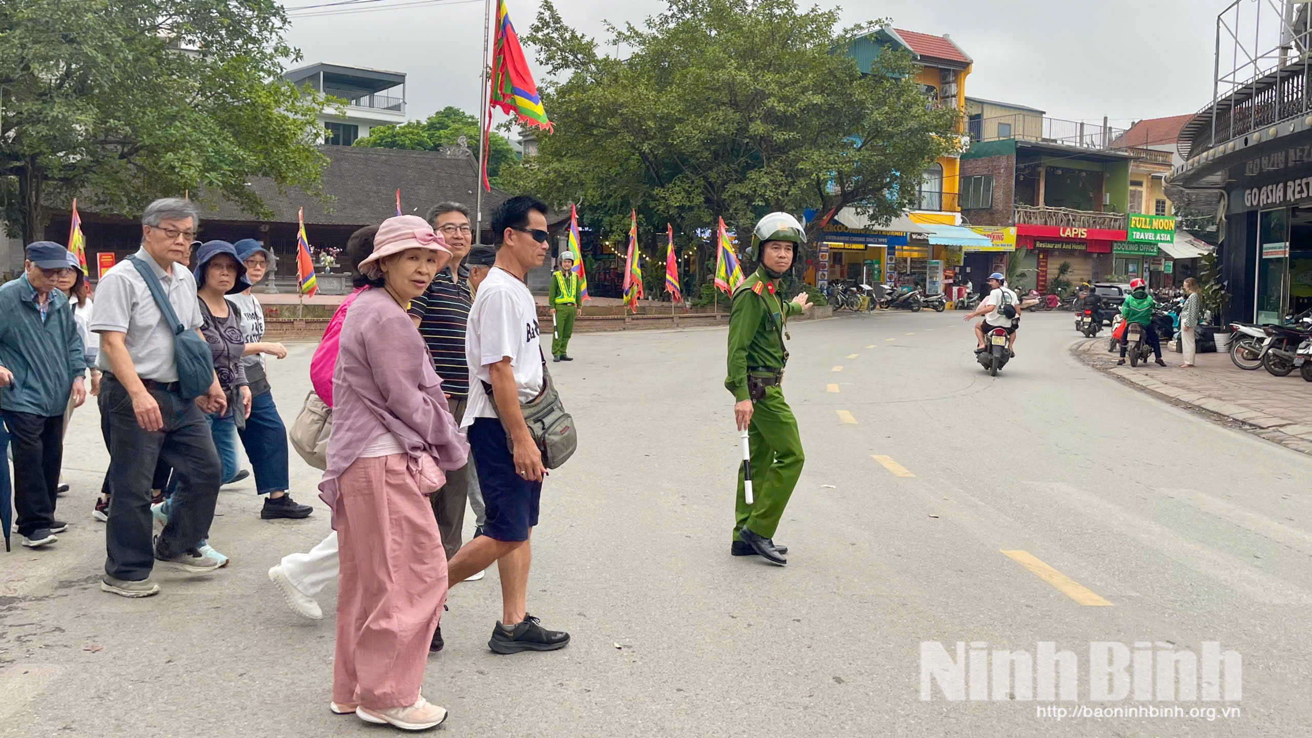 Lực lượng Công an phường Nam Hoa Lư hướng dẫn du khách tham gia giao thông tại Khu du lịch Tam Cốc - Bích Động.