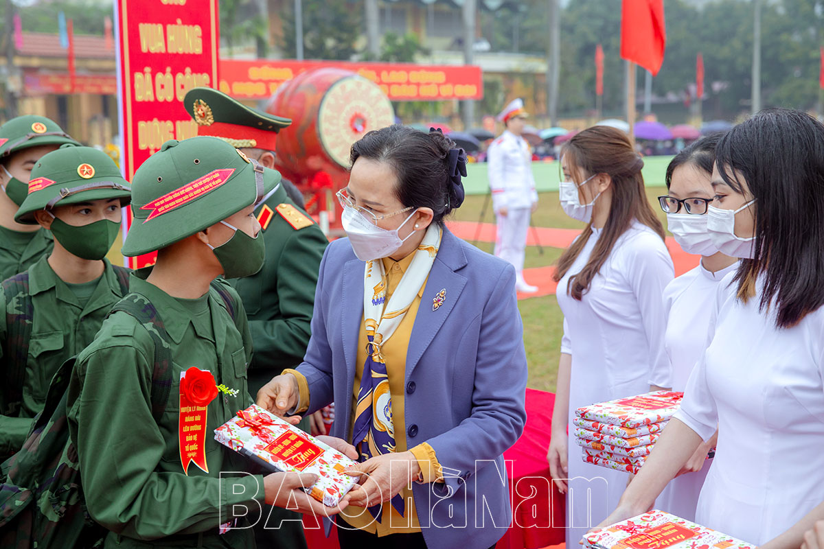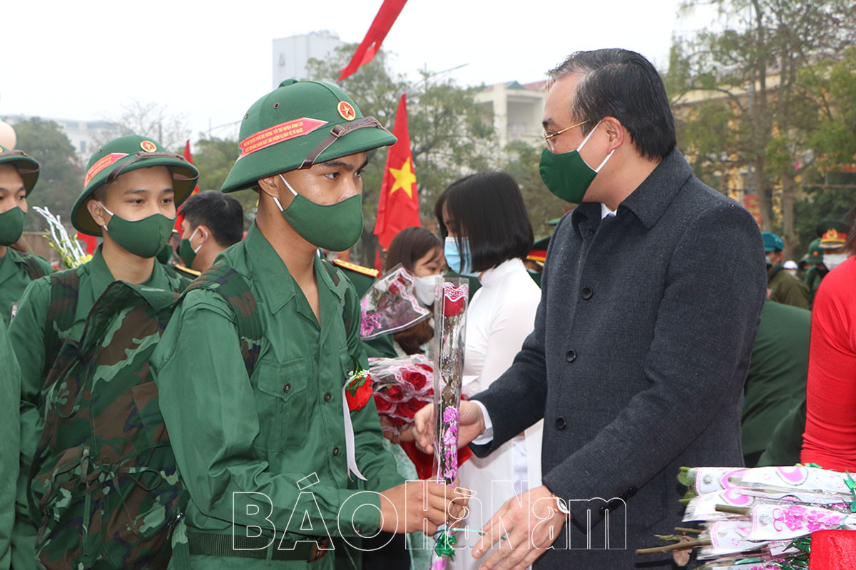 Tại buổi lễ, đồng chí Đặng Thanh Sơn, Ủy viên BTV Tỉnh ủy, Phó Chủ tịch Thường trực HĐND tỉnh và đồng chí Trần Xuân Dưỡng, TUV, Phó Chủ tịch UBND tỉnh và các đồng chí lãnh đạo huyện đã tặng hoa động viên các tân binh tiếp tục phát huy truyền thống quê hương Bình Lục anh hùng, hoàn thành tốt nghĩa vụ quân sự, cố gắng rèn luyện, học tập ở môi trường Quân đội, Công an, góp sức xây dựng quê hương, đất nước ngày càng giàu mạnh.