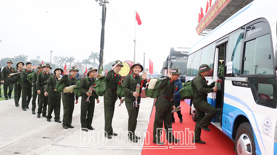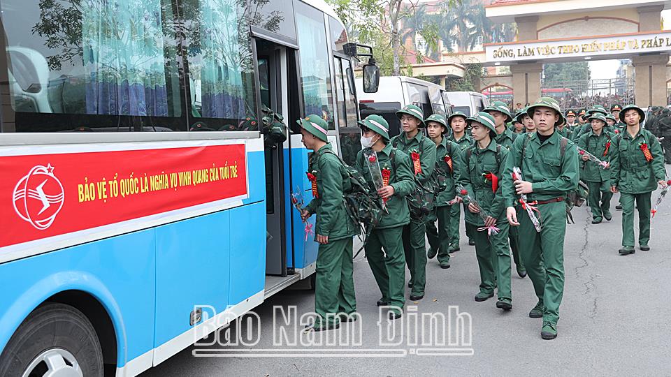 | Các tân binh huyện Trực Ninh lên xe về các đơn vị nhận quân. |