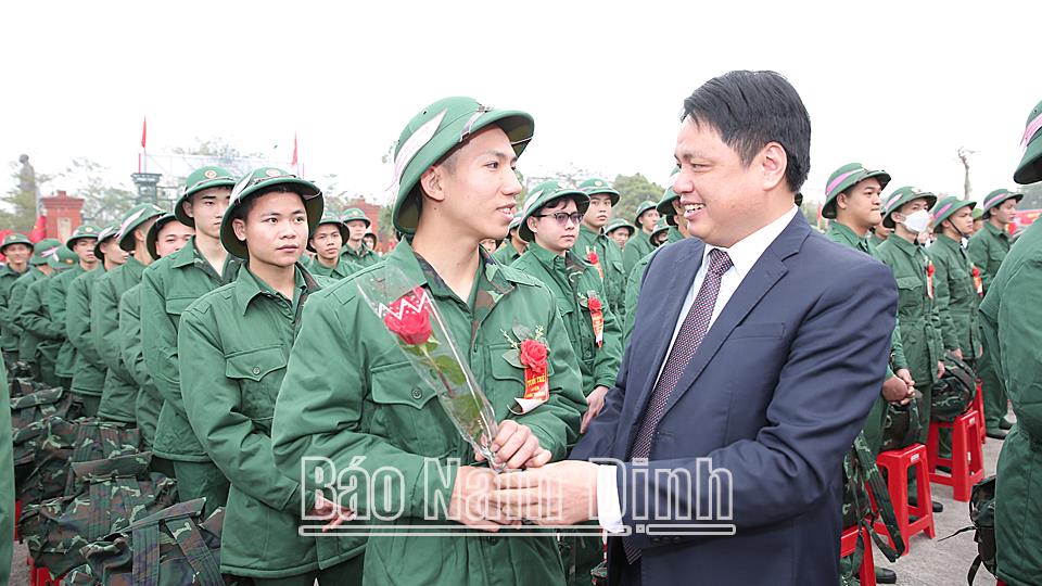 | Đồng chí Phó Chủ tịch UBND tỉnh Trần Lê Đoài tặng hoa, động viên các tân binh huyện Nghĩa Hưng lên đường nhập ngũ. |