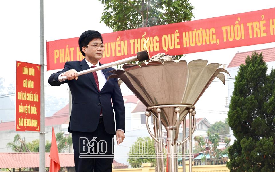 | Đồng chí Bí thư Huyện uỷ Vụ Bản Trần Minh Hoan thắp lửa truyền thống tại Lễ giao nhận quân năm 2025. |