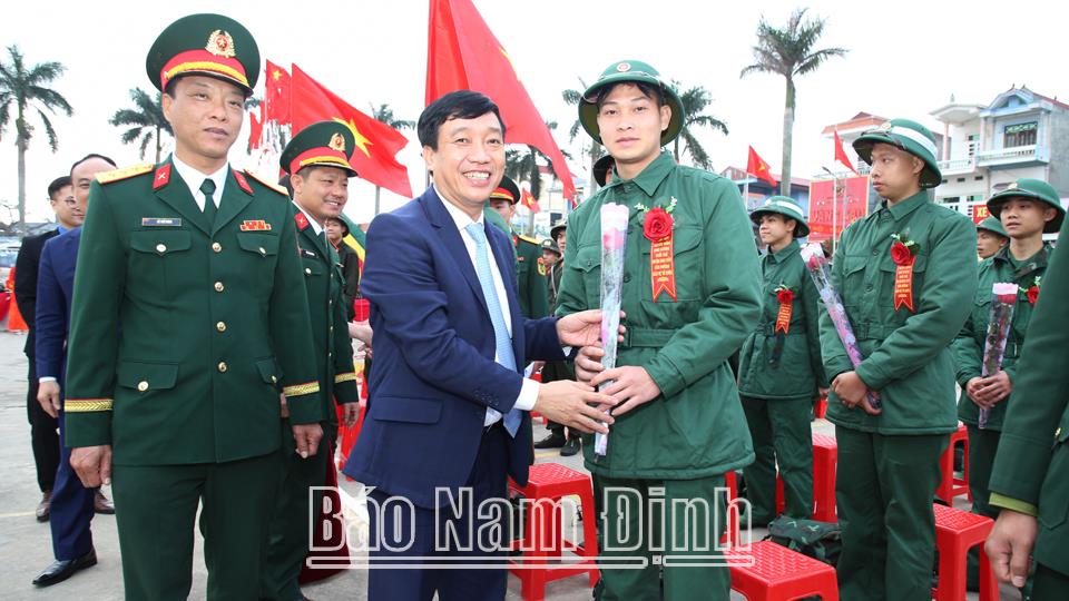 | Đồng chí Phạm Duy Hưng, Uỷ viên Ban TVTU, Trưởng Ban Dân vận Tỉnh uỷ và các đại biểu tặng hoa tân binh huyện Vụ Bản lên đường nhập ngũ. |
