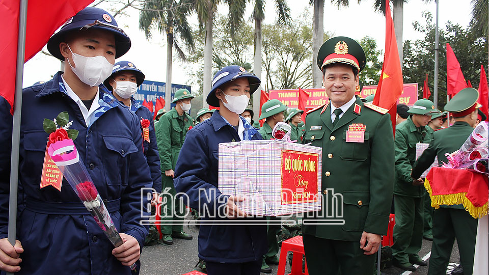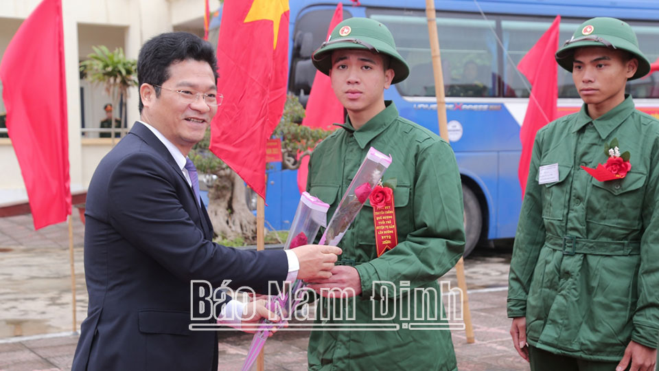 | Đồng chí Trần Lê Đoài, TUV, Phó Chủ tịch UBND tỉnh; lãnh đạo huyện Nghĩa Hưng tặng hoa động viên các tân binh lên đường nhập ngũ. |