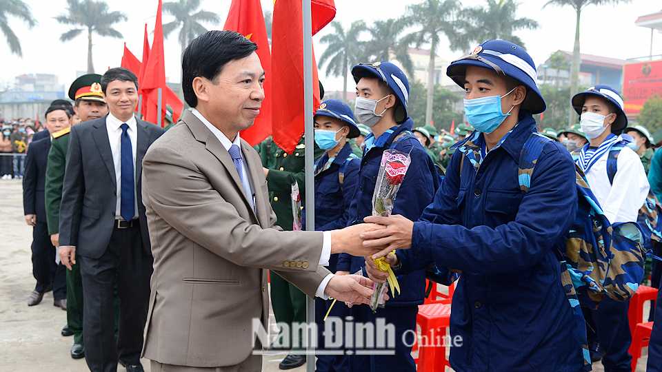 | Ðồng chí Phạm Ðình Nghị, Phó Bí thư Tỉnh ủy, Chủ tịch UBND tỉnh tặng hoa, động viên tân binh thành phố Nam Ðịnh lên đường nhập ngũ. |