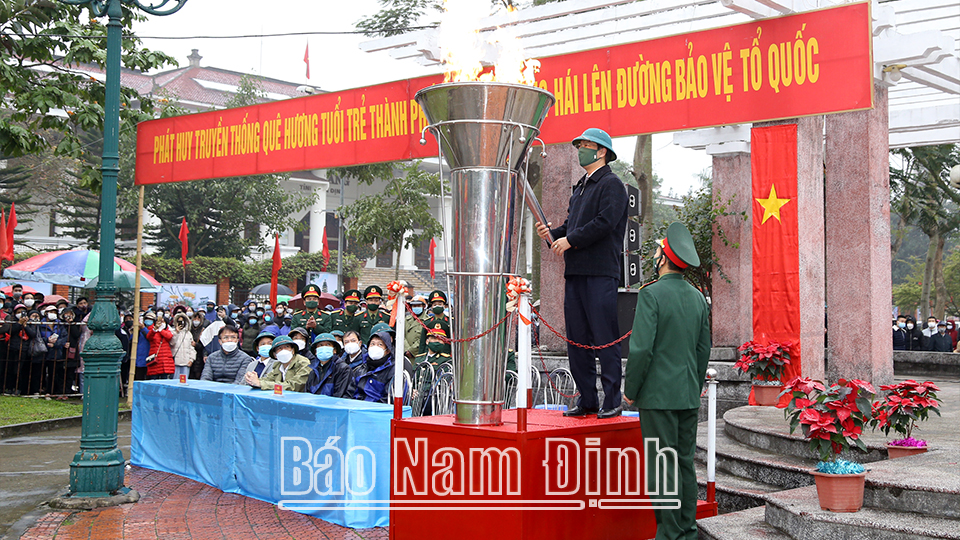 | Đồng chí Nguyễn Anh Tuấn, Ủy viên Ban TVTU, Bí thư Thành ủy, Chủ tịch HĐND thành phố Nam Định thắp lửa truyền thống. Ảnh: Văn Huỳnh |