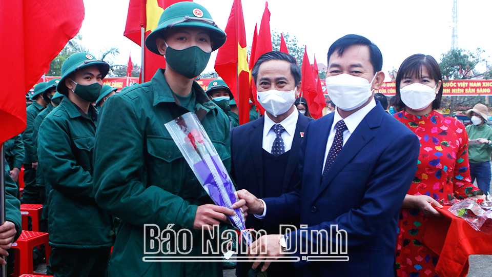 | Các đồng chí: Phạm Đình Nghị, Phó Bí thư Tỉnh ủy, Chủ tịch UBND tỉnh; Nguyễn Anh Tuấn, Ủy viên Ban TVTU, Bí thư Thành ủy, Chủ tịch HĐND thành phố Nam Định tặng hoa động viên tân binh lên đường nhập ngũ. |