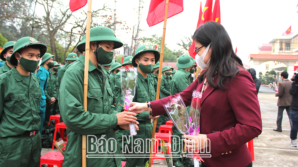 | Đồng chí Hà Lan Anh, TUV, Phó Chủ tịch UBND tỉnh tặng hoa động viên tân binh huyện Trực Ninh lên đường nhập ngũ. Ảnh: Thành Trung |