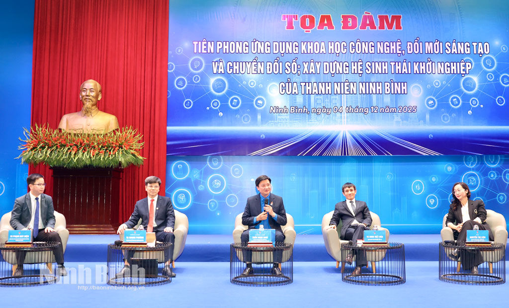Nằm trong khuôn khổ Đại hội đại biểu Đoàn Thanh niên Cộng sản Hồ Chí Minh tỉnh Ninh Bình lần thứ I, nhiệm kỳ 2025-2030, chiều 4/12, Tỉnh đoàn Ninh Bình phối hợp với Sở Khoa học và Công nghệ tổ chức buổi tọa đàm “Tiên phong ứng dụng khoa học công nghệ (KHCN), đổi mới sáng tạo và chuyển đổi số; xây dựng hệ sinh thái khởi nghiệp của thanh niên Ninh Bình”.