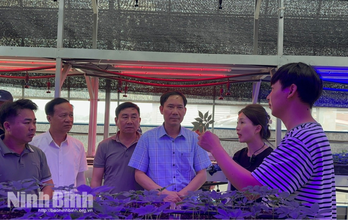 Đoàn công tác của tỉnh Ninh Bình nghe giới thiệu về quy trình nuôi trồng, chăm sóc sâm tại cơ sở nghiên cứu của Hàn Quốc.