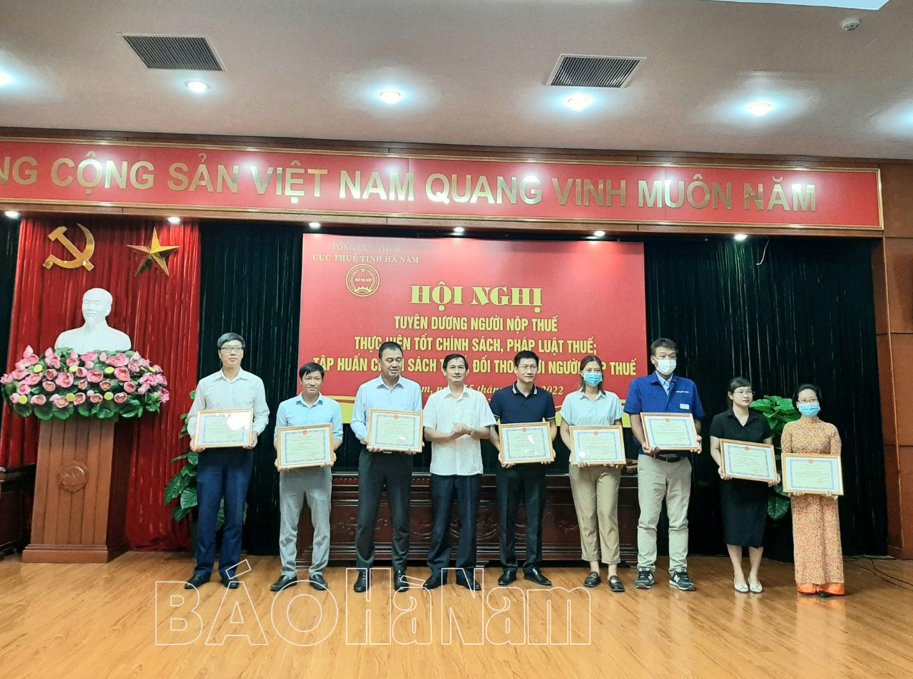Căn cứ vào thành tích sản xuất kinh doanh và nộp ngân sách Nhà nước của các đơn vị, năm 2021 ngành thuế đã bình chọn 8 doanh nghiệp trên địa bàn tỉnh được Tổng cục trưởng Tổng cục Thuế tặng giấy khen và 54 doanh nghiệp được Cục trưởng Cục Thuế tỉnh Hà Nam tặng giấy khen. Đồng thời, Cục Thuế tỉnh đã vinh danh các doanh nghiệp, tổ chức được Tổng cục trưởng Tổng cục Thuế khen thưởng về thực hiện tốt chính sách, pháp luật Thuế năm 2020 (do dịch Covid – 19 chưa thực hiện được).