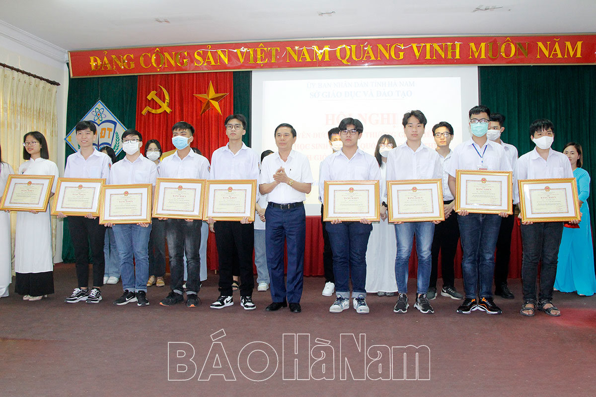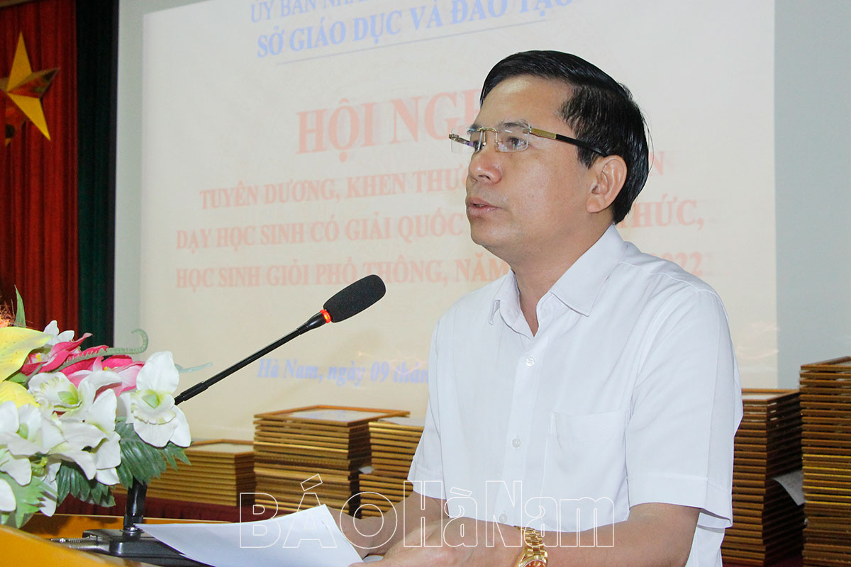 Chiều 9/5, Sở Giáo dục và Đào tạo(GD&ĐT) Hà Nam tổ chức hội nghị tuyên dương, khen thưởng giáo viên lãnh đội và học sinh giỏi (HSG) phổ thông cấp tỉnh, cấp quốc gia năm học 2021-2022. Đồng chí Trần Xuân Dưỡng- TUV, Phó Chủ tịch UBND tỉnh, dự và chỉ đạo hội nghị.