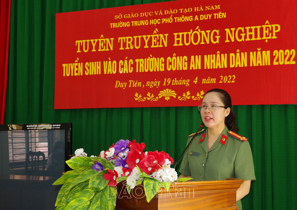Ngày 19/4, Phòng Tổ chức cán bộ Công an tỉnh phối hợp với Ban giám hiệu Trường THPT A Duy Tiên tổ chức tuyên truyền hướng nghiệp “Tuyển sinh vào Công an nhân dân năm 2022” cho đại diện cán bộ, giáo viên và các em học sinh khối 12 của nhà trường.