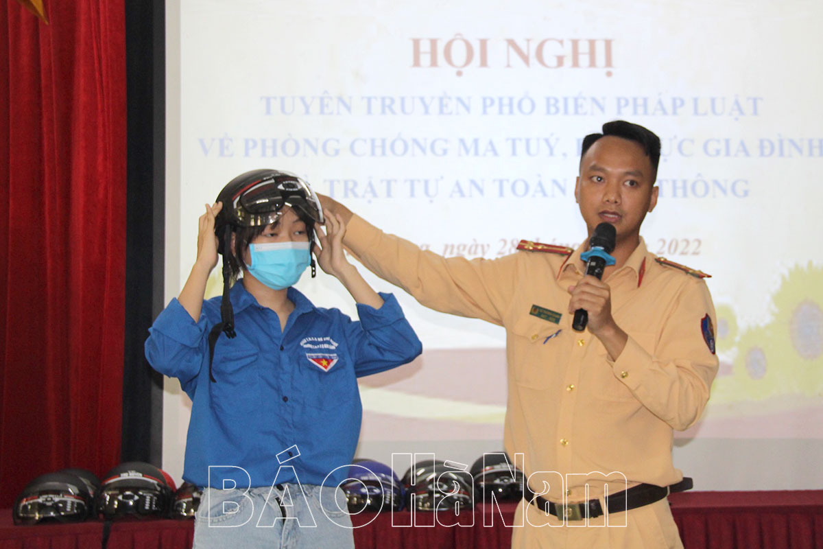 Thượng úy Vũ Trường Giang, Bí thư Chi đoàn Công an huyện Kim Bảng hướng dẫn quy định lựa chọn, sử dụng mũ bảo hiểm an toàn.