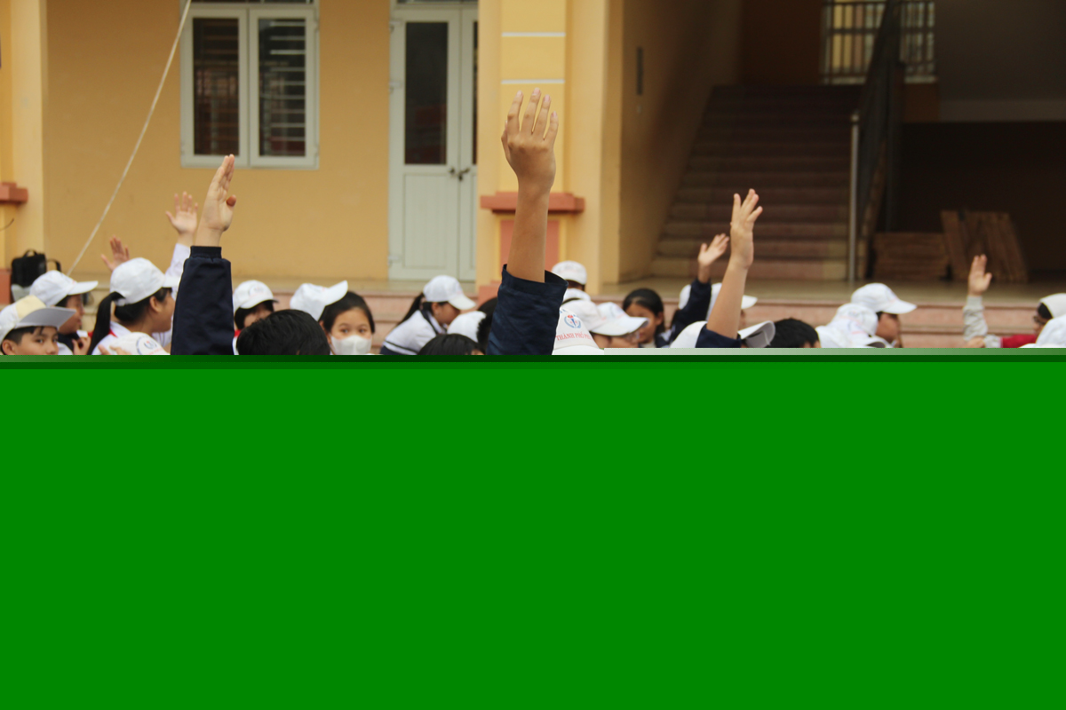 Các em học sinh hào hứng tham gia trả lời câu hỏi.Sau khi được hướng dẫn, các em học sinh trực tiếp thực hành kỹ năng dập tắt đám cháy do rò rỉ khí gas.