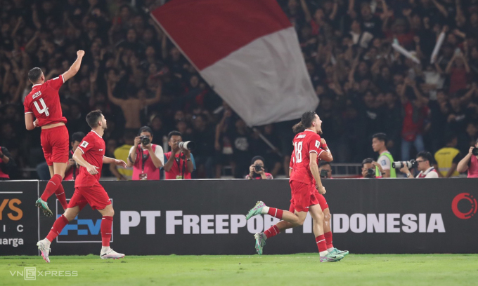 Tiền vệ Egy Maulana (số 10) đệm bóng cận thành mở tỷ số trong thế không người kèm.......giúp hơn 70.000 khán giả Indonesia trên sân Bung Karno mở hội, trong trận thắng Việt Nam tại Jakarta, lượt ba bảng F vòng loại hai World Cup 2026 tối 21/3/2024.