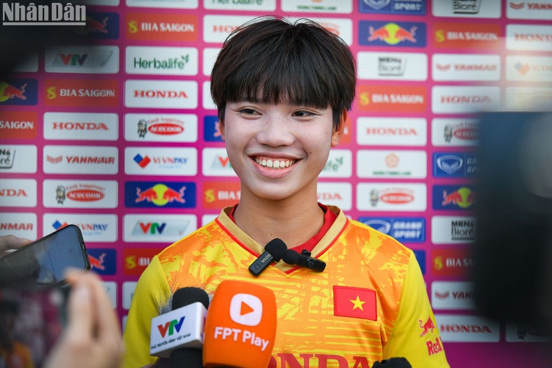 Cầu thủ trẻ Vũ Thị Hoa trước ống kính phóng viên. (Ảnh: THÀNH ĐẠT)