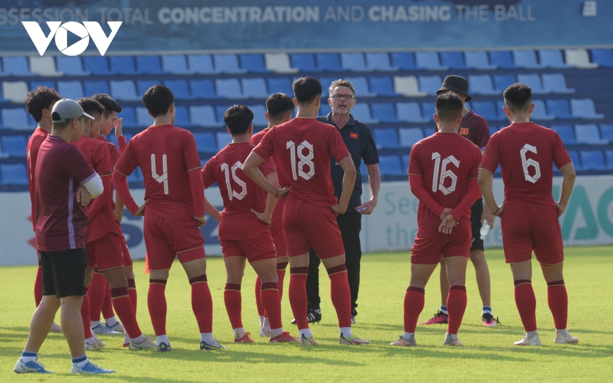 HLV Troussier và các cầu thủ U22 Việt Nam chuẩn bị rất kỹ trong buổi tập cuối cùng trước trận ra quân ở SEA Games 32.