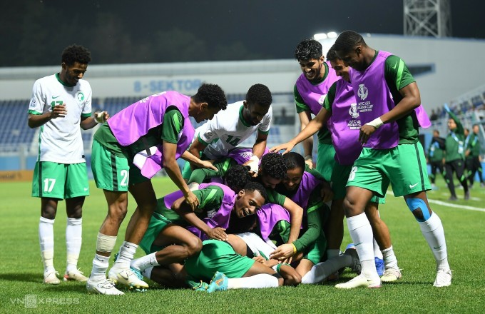 Cầu thủ Saudi Arabia mừng bàn mở tỷ số.