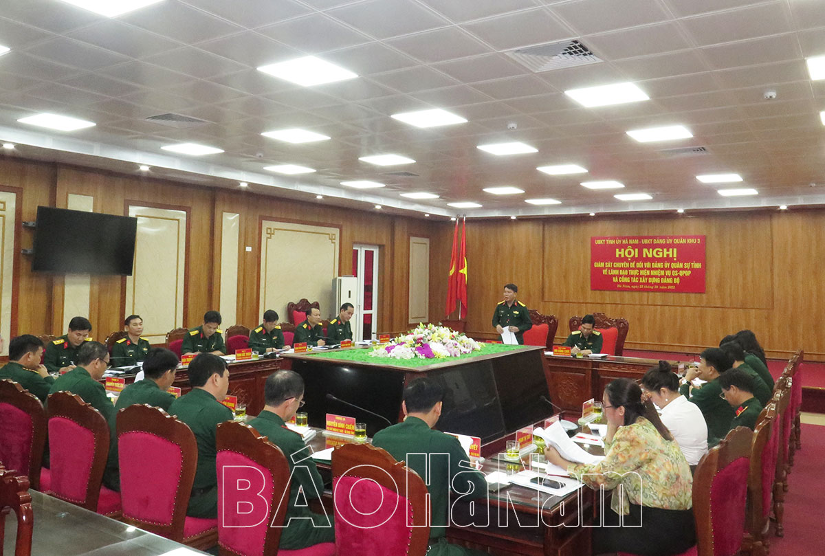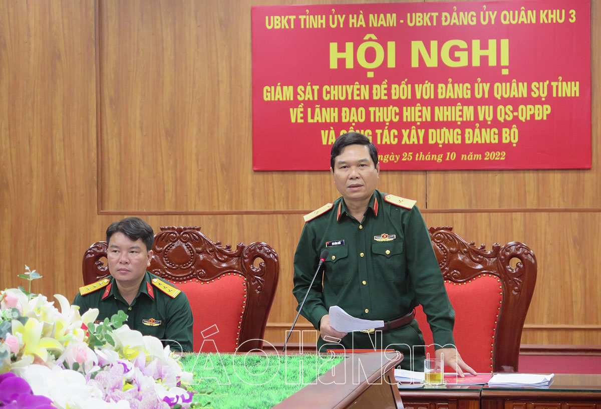 Chiều 25/10, Ủy ban Kiểm tra (UBKT) Tỉnh ủy Hà Nam phối hợp với UBKT Đảng ủy Quân khu 3 tổ chức hội nghị giám sát chuyên đề đối với Đảng ủy Quân sự (ĐUQS) tỉnh về lãnh đạo thực hiện nhiệm vụ công tác quân sự - quốc phòng địa phương (QS, QPĐP) và công tác xây dựng Đảng bộ. Thiếu tướng Bùi Công Chức, Ủy viên Ban Thường vụ, Phó Chính ủy, Chủ nhiệm UBKT Đảng ủy Quân khu 3 dự, chỉ đạo hội nghị. Tham dự hội nghị có đồng chí Lê Thị Hồng Hà, Phó Chủ nhiệm UBKT Tỉnh ủy, Trưởng đoàn giám sát; lãnh đạo, cán bộ các cơ quan chuyên môn của UBKT Đảng ủy Quân khu 3, UBKT Tỉnh ủy.