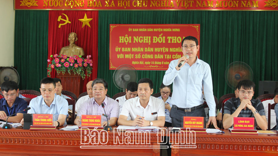 | Đồng chí Hoàng Trọng Nghĩa, Chủ tịch UBND huyện Nghĩa Hưng trả lời kiến nghị của các hộ dân khu vực Cồn Xanh. |