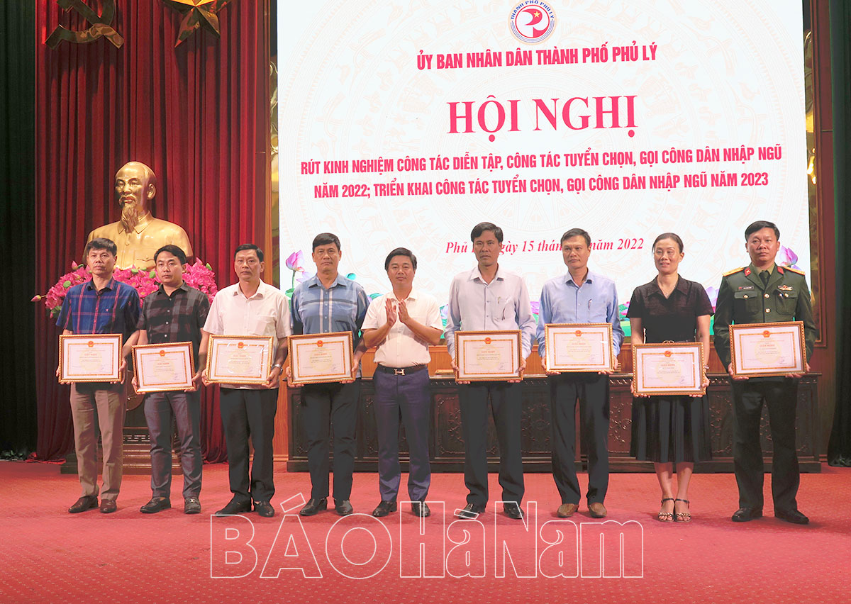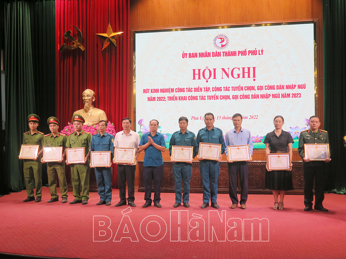 Nhân dịp này, UBND thành phố Phủ Lý đã khen thưởng 7 tập thể, cá nhân tiêu biểu trong công tác diễn tập; 21 tập thể, cá nhân trong công tác tuyển quân năm 2022.