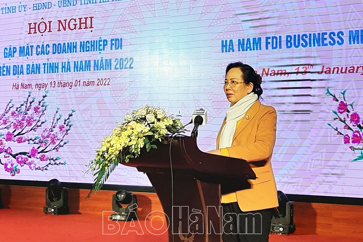 Phát biểu chúc mừng các doanh nghiệp nhân dịp xuân Nhâm Dần 2022, đồng chí Lê Thị Thủy, Ủy viên Trung ương Đảng, Bí thư Tỉnh ủy, Chủ tịch HĐND tỉnh đã ghi nhận những đóng góp tích cực của các doanh nghiệp FDI cho sự phát triển kinh tế - xã hội của tỉnh. Đồng chí Bí thư Tỉnh ủy nhấn mạnh: Năm 2021, năm đầu các cấp, các ngành trong tỉnh tập trung quán triệt, triển khai thực hiện Nghị quyết Đại hội Đảng, là năm bầu cử đại biểu Quốc hội khóa 15 và đại biểu HĐND các cấp, nhiệm kỳ 2021-2026; trong điều kiện dịch Covid-19 diễn biến phức tạp, khó lường, ảnh hưởng toàn diện, sâu rộng trên phạm vi toàn cầu, tác động trực tiếp đến mọi hoạt động kinh tế - xã hội, song với sự đoàn kết, nỗ lực của Đảng bộ, chính quyền, quân và dân Hà Nam nên kinh tế tỉnh nhà tiếp tục ổn định, phát triển.