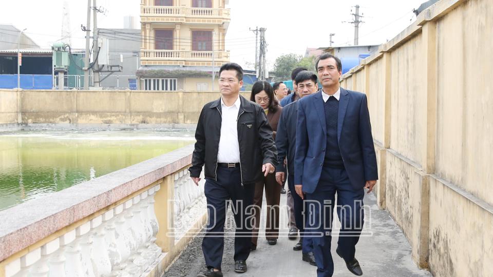 | Đồng chí Phó Chủ tịch Thường trực UBND tỉnh Trần Anh Dũng kiểm tra Nhà máy xử lý nước thải tại làng nghề Bình Yên, xã Nam Thanh (Nam Trực). |