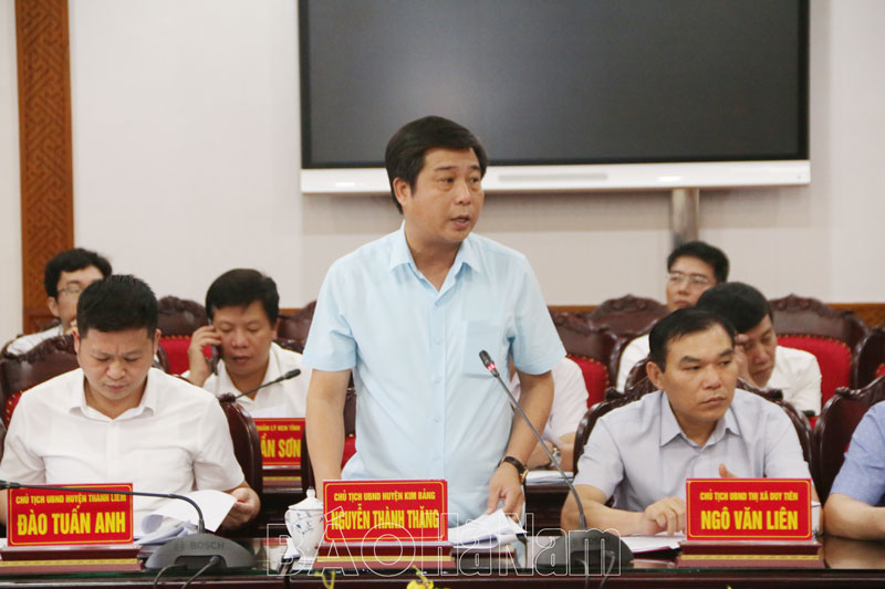 Chủ tịch UBND huyện Kim Bảng Nguyễn Thành Thăng phát biểu tại hội nghị.