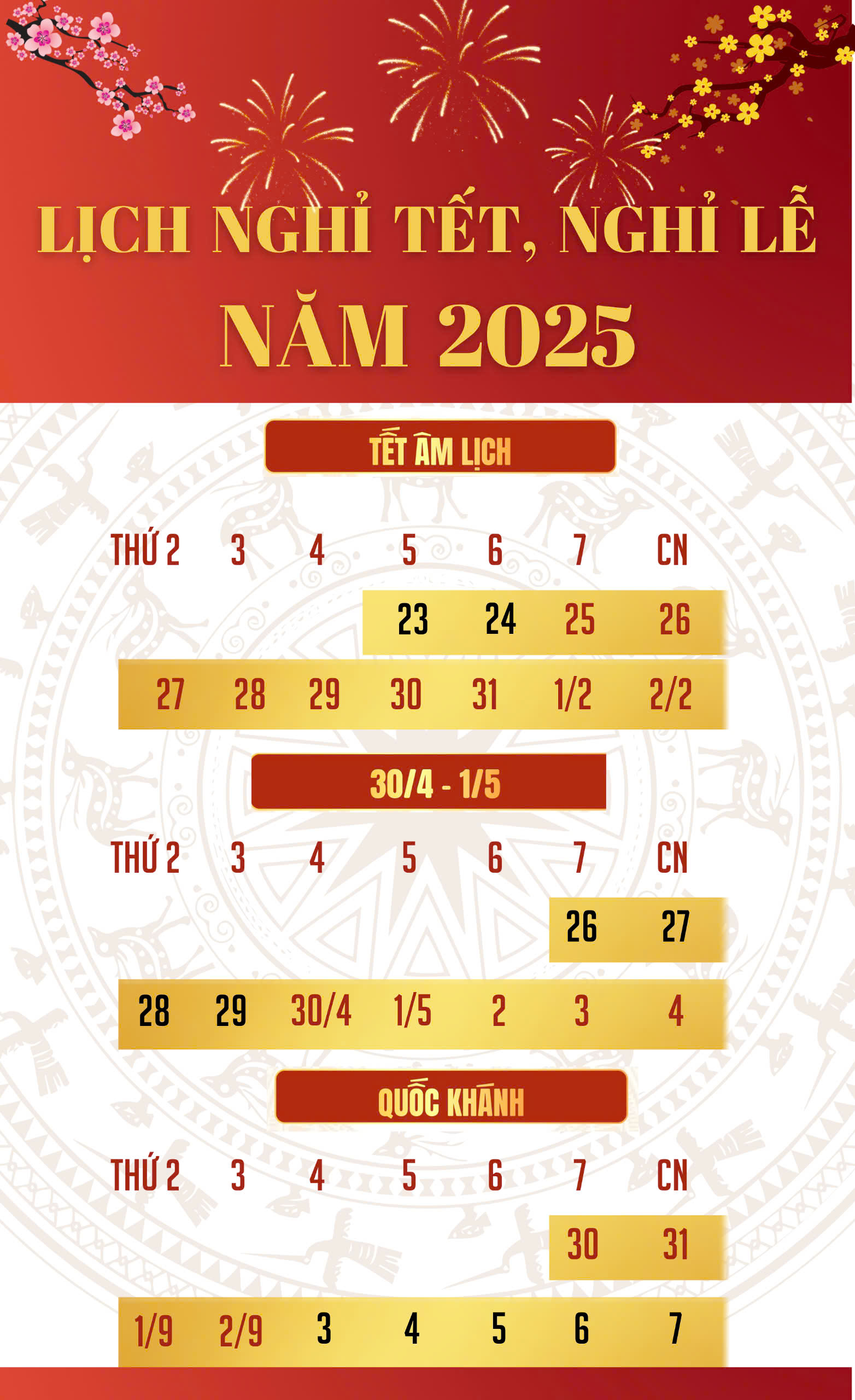 Thực hiện Thông báo số 6150/TB-LĐTBXH ngày 03/12/2024 của Bộ Lao động - Thương binh và Xã hội, UBND tỉnh vừa ban hành Thông báo 297/TB-UBND để các cơ quan hành chính, sự nghiệp, tổ chức chính trị, tổ chức chính trị - xã hội, doanh nghiệp và người sử dụng lao động khác thực hiện lịch nghỉ Tết Âm lịch và nghỉ Lễ Quốc khánh và các ngày lễ lớn trong năm 2025.