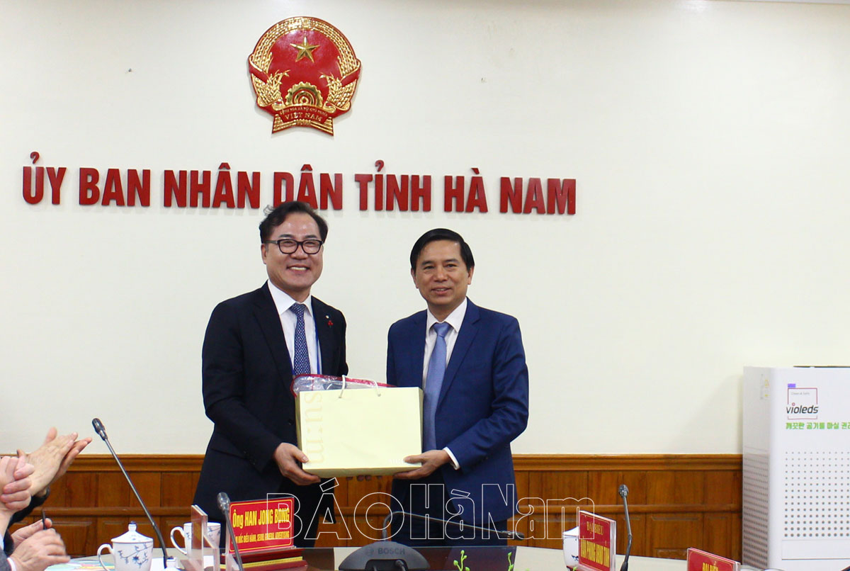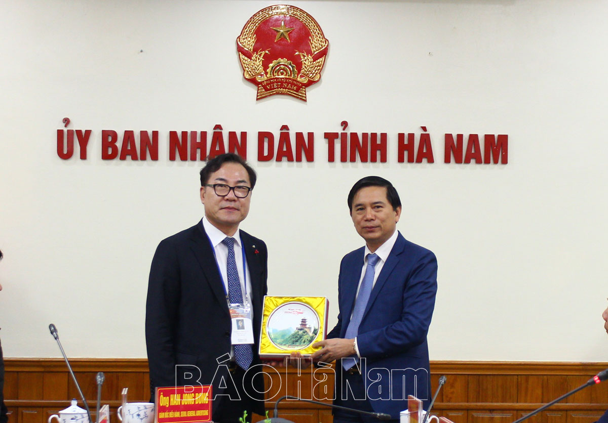 Phát biểu chào mừng đoàn công tác, đồng chí Phó Chủ tịch UBND tỉnh Trần Xuân Dưỡng đã giới thiệu nhanh về tình hình phát triển kinh tế - xã hội, kết quả thu hút đầu tư, tiềm năng, lợi thế của tỉnh. Đồng chí Phó Chủ tịch UBND tỉnh nhấn mạnh: Hiện nay có gần 200 doanh nghiệp Hàn Quốc đang đầu tư tại Hà Nam và có nhiều người Hàn Quốc đang sinh sống, làm việc tại tỉnh. Tỉnh Hà Nam luôn đánh giá cao năng lực của doanh nghiệp Hàn Quốc và xem doanh nghiệp Hàn Quốc là đối tác chiến lược quan trọng, tin cậy của tỉnh. Thời gian qua, tỉnh Hà Nam đã tổ chức các chuyến thăm, xúc tiến đầu tư tại Hàn Quốc cũng như đón nhiều đoàn công tác của Hàn Quốc đến thăm, tìm hiểu môi trường đầu tư tại tỉnh.