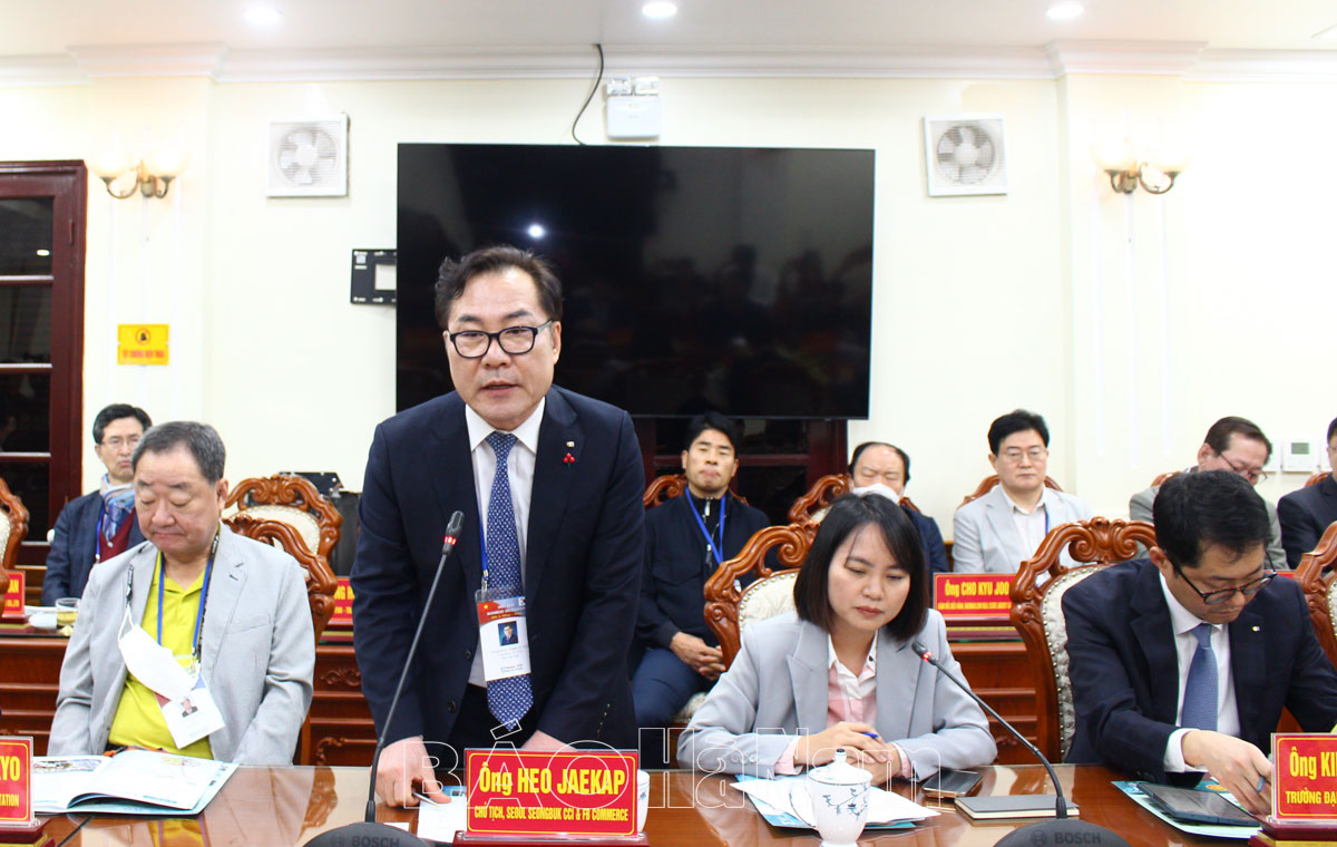 Phát biểu tại buổi làm việc, ngài Heo Jaekap, Chủ tịch Phòng Thương mại và Công nghiệp quận Seongbuk đã thông tin nhanh về tình hình phát triển của doanh nghiệp Hàn Quốc tại Việt Nam và cho biết, Việt Nam hiện đang là thị trường lớn thứ 3 và là bạn hàng lớn thứ 4 của Hàn Quốc.