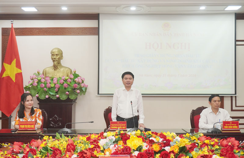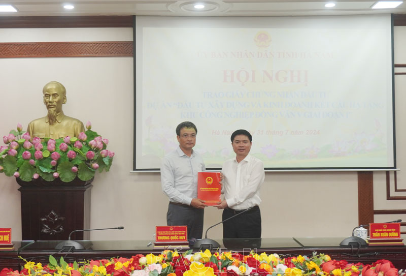 Chiều ngày 31/7, UBND tỉnh tổ chức Hội nghị trao Giấy chứng nhận đăng ký đầu tư Dự án đầu tư xây dựng và kinh doanh kết cấu hạ tầng Khu công nghiệp (KCN) Đồng Văn V, giai đoạn I. Dự hội nghị có các đồng chí: Trương Quốc Huy, Phó Bí thư Tỉnh ủy, Chủ tịch UBND tỉnh, Trưởng đoàn đại biểu Quốc hội tỉnh; Trần Xuân Dưỡng, Tỉnh ủy viên, Phó Chủ tịch UBND tỉnh. Cùng dự có lãnh đạo các sở, ngành liên quan, Ban Quản lý các KCN tỉnh; lãnh đạo UBND thị xã Duy Tiên và đơn vị đầu tư.