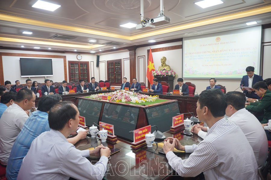 Chiều 29/11, UBND tỉnh tổ chức hội nghị trao Giấy chứng nhận đăng ký đầu tư dự án “Đầu tư xây dựng và kinh doanh kết cấu hạ tầng Khu công nghiệp hỗ trợ Đồng Văn III phía Đông đường cao tốc Cầu Giẽ - Ninh Bình” cho nhà đầu tư - Công ty Cổ phần Đầu tư bất động sản Taseco. Đồng chí Trương Quốc Huy, Phó Bí thư Tỉnh ủy, Chủ tịch UBND tỉnh, Trưởng đoàn Đại biểu Quốc hội tỉnh chủ trì hội nghị. Tham dự hội nghị có đồng chí Trần Xuân Dưỡng, TUV, Phó Chủ tịch UBND tỉnh; lãnh đạo các sở, ban ngành của tỉnh và thị xã Duy Tiên.