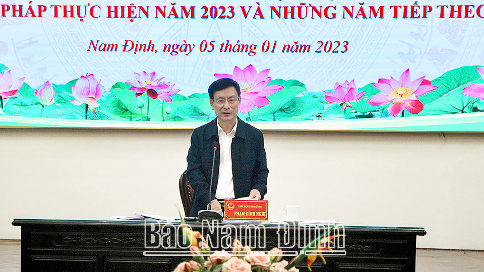 Phát biểu kết luận hội nghị, đồng chí Chủ tịch UBND tỉnh Phạm Đình Nghị yêu cầu các ngành căn cứ chương trình công tác trọng tâm của UBND tỉnh năm 2023 để rà soát, điều chỉnh nhiệm vụ của ngành mình cho phù hợp. Đối với nhiệm vụ trọng tâm 2 tháng đầu năm 2023, đồng chí yêu cầu các cấp chính quyền, các ngành: Khẩn trương thực hiện nốt các phần việc còn lại hoàn tất nhiệm vụ lập Quy hoạch chung của tỉnh; đẩy nhanh tiến độ thi công các dự án trọng điểm; tích cực giải ngân vốn đầu tư công; tích cực thu ngân sách ngay từ đầu năm; tập trung thực hiện các nhiệm vụ liên quan đến quản lý, sử dụng đất.