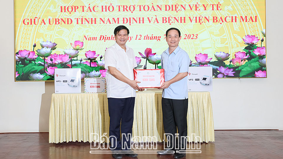 Tại buổi lễ ký kết, Bệnh viện Bạch Mai đã trao tặng một số thiết bị y tế cho ngành Y tế tỉnh Nam Định./.