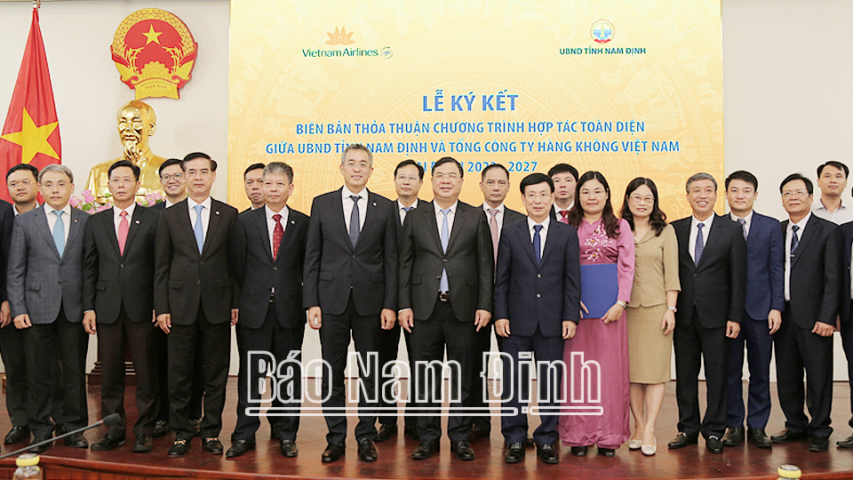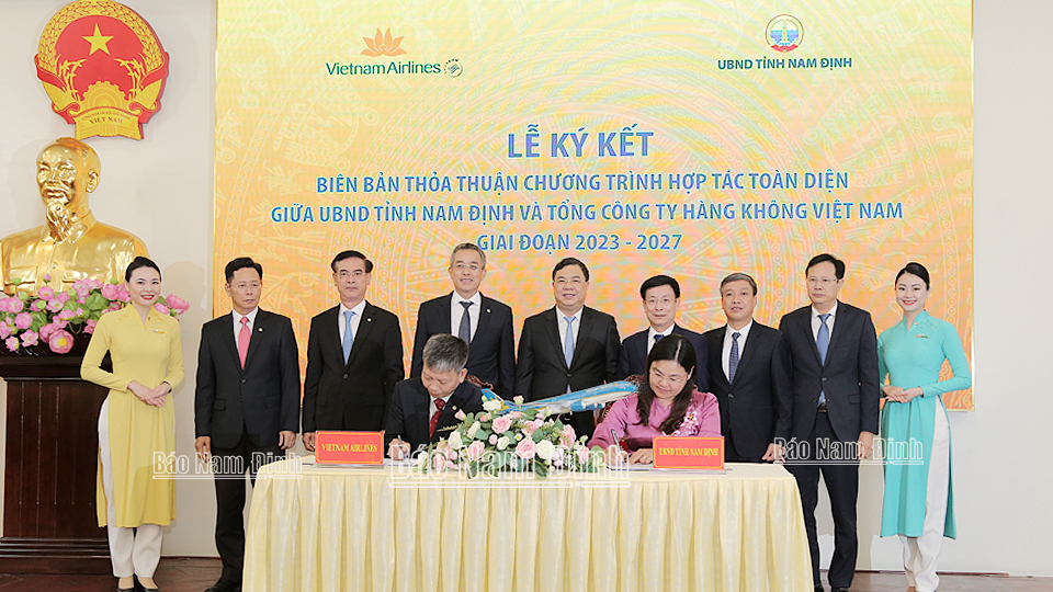 Chiều 15-8, UBND tỉnh tổ chức lễ ký kết biên bản thỏa thuận hợp tác toàn diện với Tổng Công ty Hàng không Việt Nam (Vietnam Airlines). Dự lễ ký kết, về phía tỉnh Nam Định có các đồng chí: Phạm Gia Túc, Ủy viên BCH Trung ương Đảng, Bí thư Tỉnh ủy; Phạm Đình Nghị, Phó Bí thư Tỉnh ủy, Chủ tịch UBND tỉnh; Hà Lan Anh, TUV, Phó Chủ tịch UBND tỉnh; lãnh đạo các sở, ban, ngành của tỉnh.