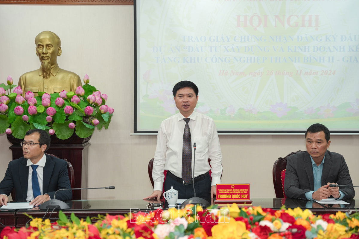 Phát biểu tại hội nghị, đồng chí Chủ tịch UBND tỉnh Trương Quốc Huy chúc mừng Công ty TNHH Đầu tư phát triển hạ tầng KCN Thanh Bình là nhà đầu tư thực hiện dự án. Đồng chí Chủ tịch UBND tỉnh nhấn mạnh: Quan điểm phát triển kinh tế - xã hội của tỉnh, lấy phát triển KCN là một trong những nhiệm vụ quan trọng để thu hút nhà đầu tư, giải quyết việc làm cho lao động, thúc đẩy kinh tế tăng trưởng và phát triển đô thị. Đây cũng là mục tiêu hướng tới đưa Thanh Liêm trở thành thị xã trước năm 2030.