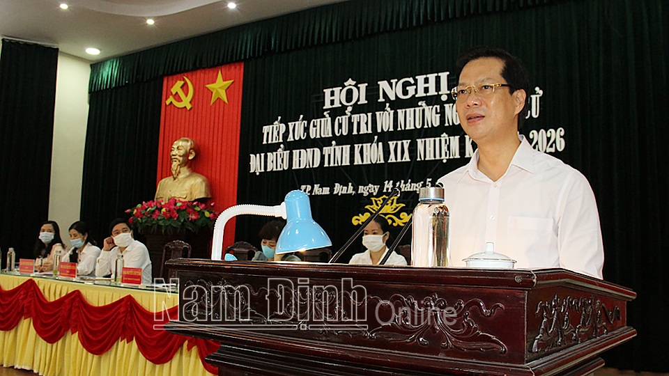 hiều ngày 14-5, các ứng cử viên đại biểu HĐND tỉnh tại đơn vị bầu cử số 1 gồm có các đồng chí: Nguyễn Anh Tuấn, Ủy viên Ban TVTU, Bí thư Thành ủy Nam Định; Nguyễn Tiến Dũng, Ủy viên BCH Đảng bộ tỉnh, Giám đốc Sở Văn hóa, Thể thao và Du lịch; Đỗ Thị Hà, Công chức Phòng Y tế thành phố Nam Định; Lương Thị Thu Phương, Phó bí thư Đảng ủy, Chủ tịch UBND phường Trần Đăng Ninh (thành phố Nam Định); Nguyễn Thị Trang, Trưởng phòng Bổ sung, xử lý tài liệu, Thư viện tỉnh Nam Định; Trần Thị Minh Vân, Giám đốc Công ty Cổ phần Thương mại Hương Giang; Trần Thị Hải Yến, công chức UBND phường Mỹ Xá (thành phố Nam Định) tiếp xúc cử tri thành phố Nam Định.