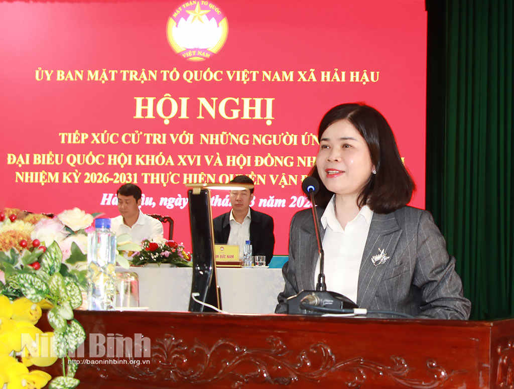 * Tại Nhà văn hoá xã Hải Hậu, các ứng cử viên ĐBQH khoá XVI (Đơn vị bầu cử số 7) và ứng cử viên đại biểu HĐND tỉnh khoá XVI, nhiệm kỳ 2026 - 2031 (Đơn vị bầu cử số 20) đã có buổi tiếp xúc cử tri để thực hiện quyền vận động bầu cử.
