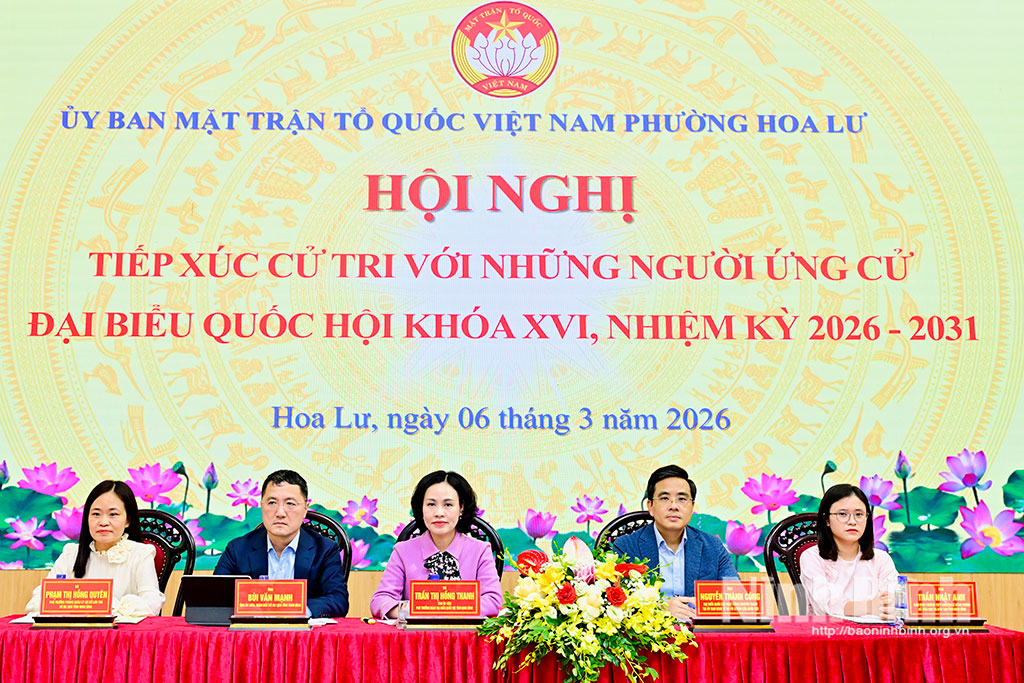 * Chiều 6/3, Ban Thường trực Ủy ban MTTQ Việt Nam phường Hoa Lư tổ chức hội nghị tiếp xúc giữa cử tri với những người ứng cử ĐBQH khóa XVI tại Đơn vị bầu cử số 3. Dự hội nghị có đồng chí Bùi Thành Đông, Tỉnh ủy viên, Bí thư Đảng ủy phường Hoa Lư.