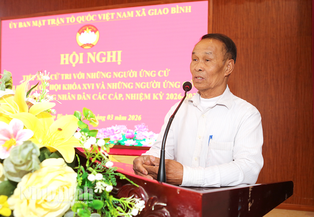 * Chiều 8/3, Ban Thường trực Ủy ban Mặt trận Tổ quốc (MTTQ) Việt Nam xã Giao Bình phối hợp với UBND, Ủy ban Bầu cử xã tổ chức hội nghị tiếp xúc giữa cử tri với những người ứng cử ĐBQH khóa XVI, Đơn vị bầu cử số 8 và ứng cử viên đại biểu HĐND tỉnh Ninh Bình khóa XVI, nhiệm kỳ 2026 - 2031, Đơn vị bầu cử số 22.