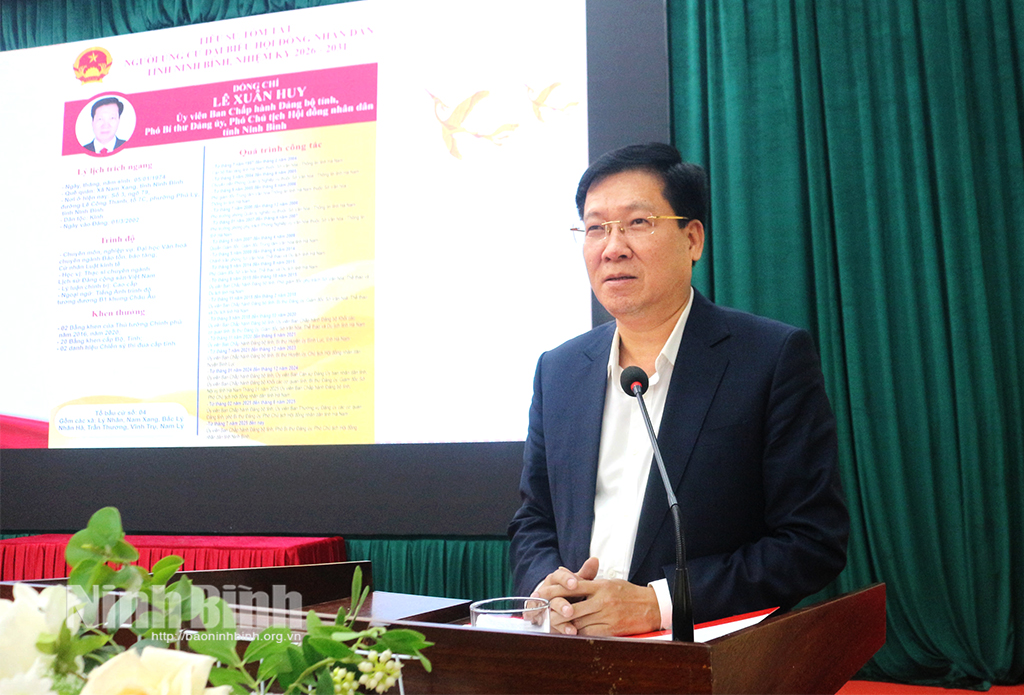 Các ứng cử viên đại biểu HĐND tỉnh Ninh Bình, nhiệm kỳ 2026- 2031 tại Đơn vị bầu cử số 4 gồm các ông, bà: Nguyễn Minh Tiến, Uỷ viên Ban Thường vụ Tỉnh uỷ, Trưởng Ban Nội chính Tỉnh uỷ; Lê Xuân Huy, Tỉnh uỷ viên, Phó Chủ tịch HĐND tỉnh; Phạm Anh Tuấn, Tỉnh uỷ viên, Trưởng Ban Văn hoá - Xã hội, HĐND tỉnh; Lê Thị Hồng Hà, Bí thư Đảng uỷ, Chủ tịch HĐND xã Vĩnh Trụ; Trần Thị Anh, Phó Trưởng Phòng Theo dõi công tác xử lý đơn, thư, tiếp công dân, Ban Nội chính Tỉnh uỷ; Nguyễn Thị Trung Anh, công chức Phòng Xây dựng công trình, Sở Nông nghiệp và Môi trường; Trần Ngọc Huyền, công chức Uỷ ban MTTQ Việt Nam xã Vĩnh Trụ.