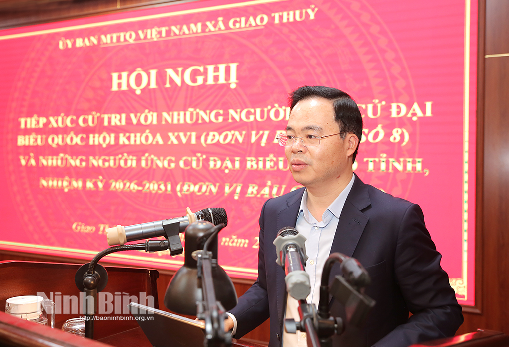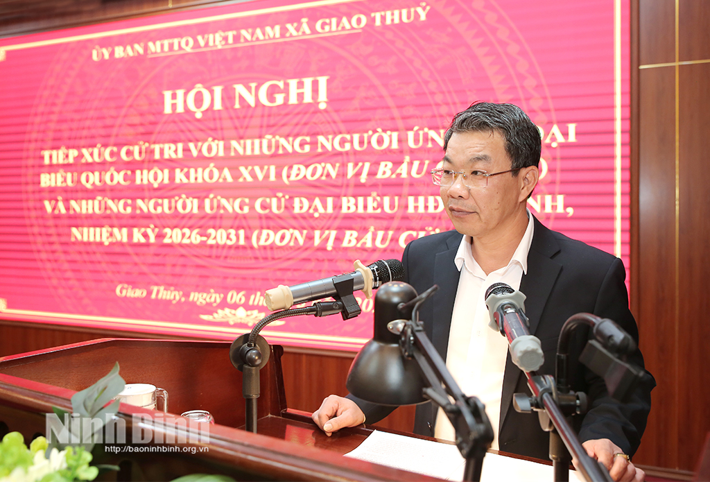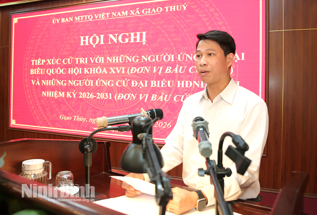 * Sáng 6/3, Ban Thường trực Ủy ban MTTQ Việt Nam xã Giao Thủy tổ chức hội nghị tiếp xúc cử tri để những người ứng cử đại biểu Quốc hội (ĐBQH) khóa XVI tại Đơn vị bầu cử số 8 và những người ứng cử đại biểu HĐND tỉnh nhiệm kỳ 2026-2031 tại Đơn vị bầu cử số 22 thực hiện quyền vận động bầu cử theo quy định của pháp luật.