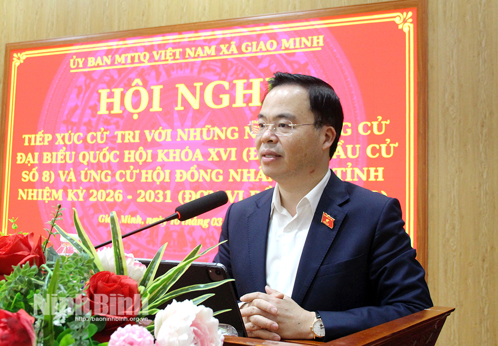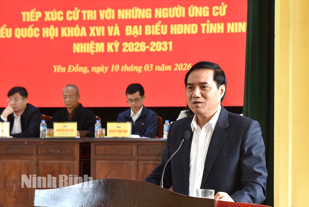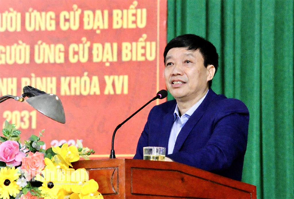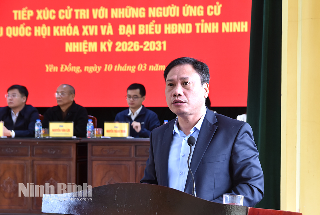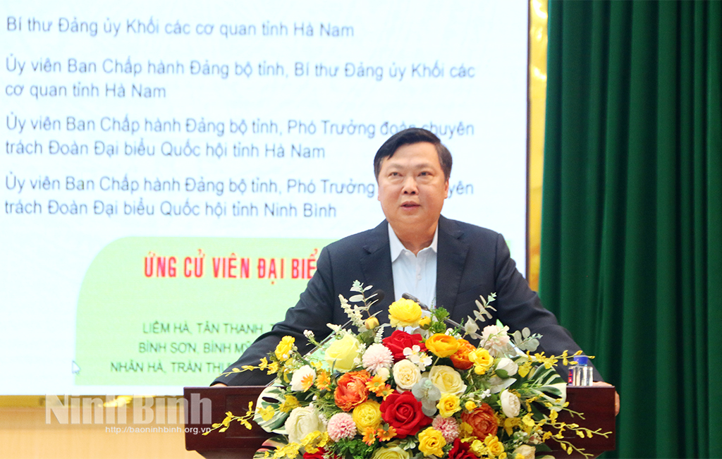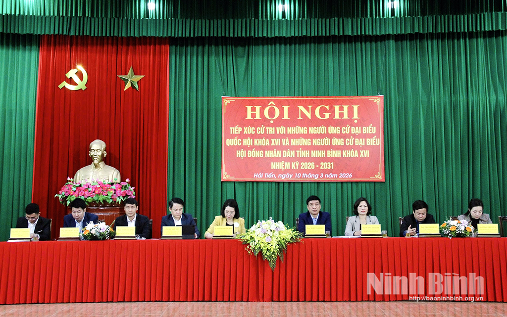 Hội nghị nghe giới thiệu tiểu sử các ứng cử viên đại biểu HĐND tỉnh nhiệm kỳ 2026 - 2031 ở Đơn vị bầu cử số 7, gồm các ông, bà: Bùi Hoàng Hà, Uỷ viên Ban Thường vụ Tỉnh uỷ, Phó Chủ tịch Thường trực HĐND tỉnh; Đặng Đức Tân, Tỉnh ủy viên, Bí thư Đảng ủy phường Tam Điệp; Hoàng Khắc Tiệp, Bí thư Đảng ủy, Chủ tịch HĐND xã Nho Quan; Lê Thu Hà, Phó Trưởng Ban Văn hoá - Xã hội HĐND tỉnh; Đỗ Văn Hoan, Phó Trưởng Ban Kinh tế - Ngân sách HĐND tỉnh; Phan Thanh Hương, Kiểm tra viên chính, Viện Kiểm sát Nhân dân tỉnh; Đoàn Thị Phượng, Công chức Văn phòng Đảng ủy phường Tam Điệp; Trần Thị Quỳnh Anh, Giáo viên Trường Tiểu học Nho Quan.