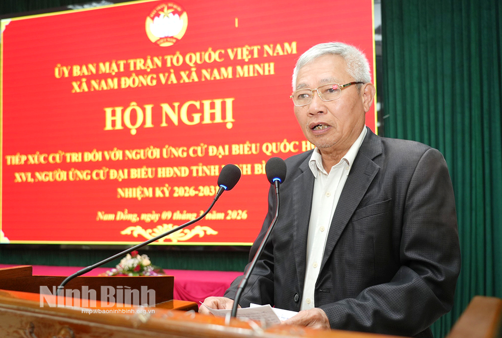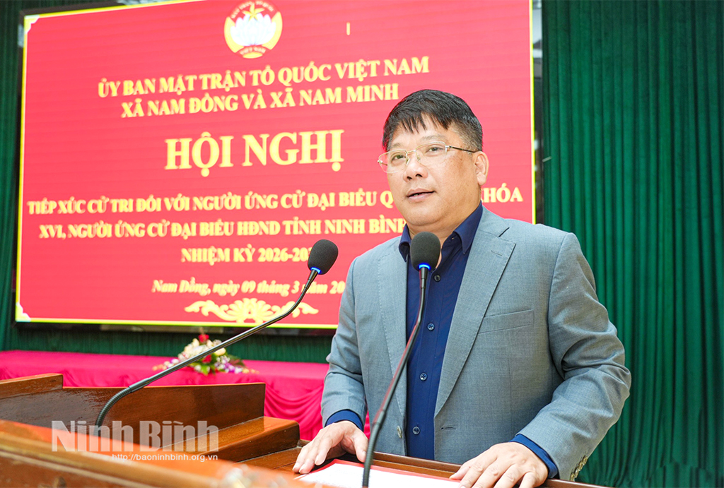 * Sáng 9/3, tại xã Nam Đồng, Ban Thường trực Ủy ban MTTQ Việt Nam xã Nam Đồng và xã Nam Minh phối hợp tổ chức hội nghị tiếp xúc cử tri với người ứng cử đại biểu Quốc hội (ĐBQH) khóa XVI tại Đơn vị bầu cử số 6 và đại biểu HĐND tỉnh nhiệm kỳ 2026-2031 tại Đơn vị bầu cử số 16.